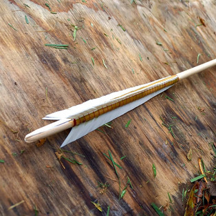 The arrow in the archives has a yellow compound, the thickness of which I have measured and reproduced using a new, more correct mixture. The 6.5" swan fletchings are bound into this compound with red silk. The delicate nock is reinforced with a 1mm thick Dorset cow horn strip, fixed with fish glue. _____