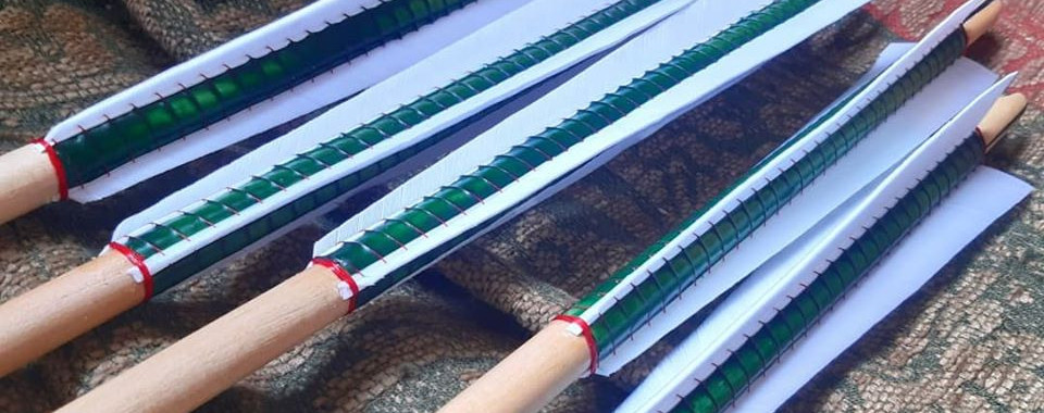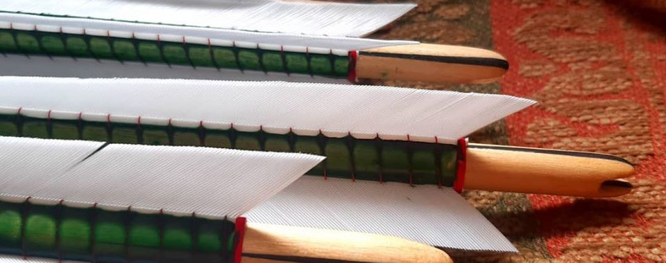 1/2" white birch shafts, with tapered horn inserts. Swan feathers bound with silk into a verdigris compound and a variety of heads - two heavy war Type 9s, a long Type 7, a long Type 10 and a big Type 13!