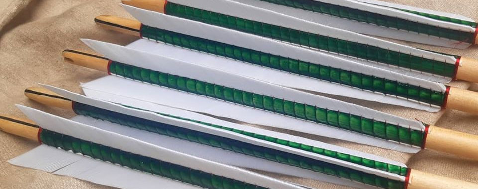 Six 3/8" birch arrows for a 70lb bow with green and white feathers and hand forged Type 5 practice heads ___________ Six 3/8" birch arrows for a 110lb bow with red and white feathers and Type 5s ___________ This is a nice example of arrowshaft size relating to draw weight, as there's still an odd belief that once you hit 90 or 100lb in draw weight you suddenly need whacking great 1/2" arrows.