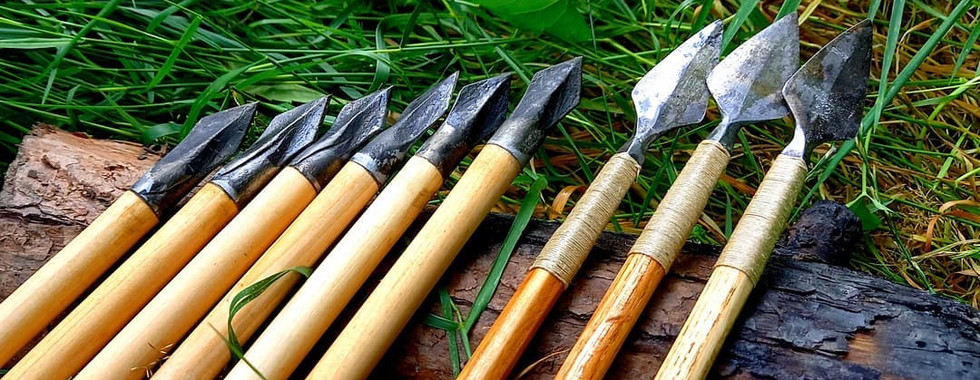 The Viking arrows are 10mm ash, with four fletchings tightly bound with hemp into a birch tar glue, with bulbous nocks and my Type 1 tanged arrowheads glued with tar and bound with hemp.
