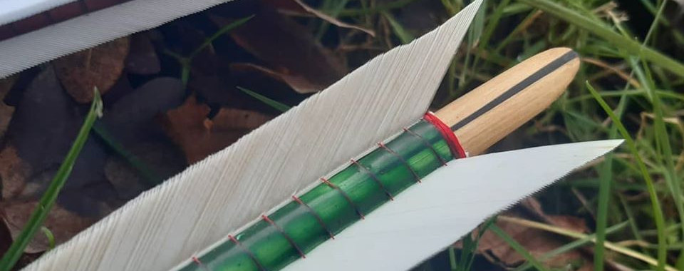 The two hunting arrows are 3/8" ash and fletched with swan into a red iron oxide fletching compound and tipped with Type 13 hunting heads.
